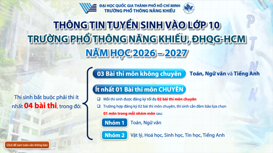 - Thông báo tuyển sinh vào lớp 10 trường Phổ thông Năng khiếu, Năm học 2026 – 2027